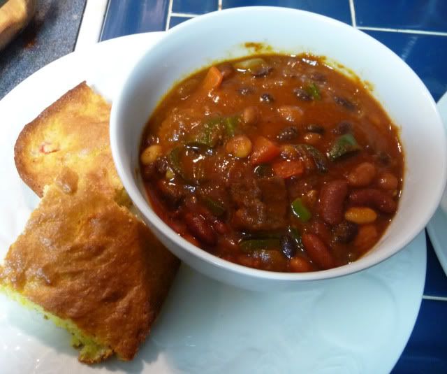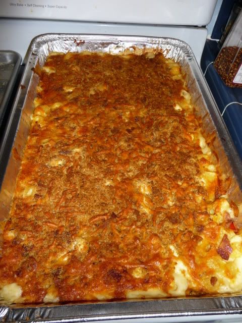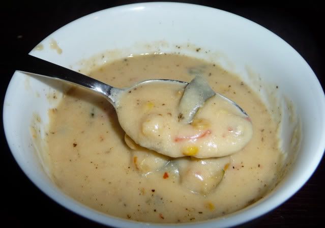 The second layer is where the bulk of the kickin up kicked in. Instead of just corn, Brandon whipped up a batch of his succotash, including zucchini, poblanos, and red peppers. He seasoned it with a bit of garlic salt and sauteed the veg, then added it to the corn. (Still steamy in the pic below!)