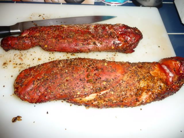 Brandon also smoked some pork tenderloin. He used his mixture of spices: garlic salt, coarse ground black pepper, red pepper flake, oregano, chili powder, and let it sit for a couple of hours in the fridge...